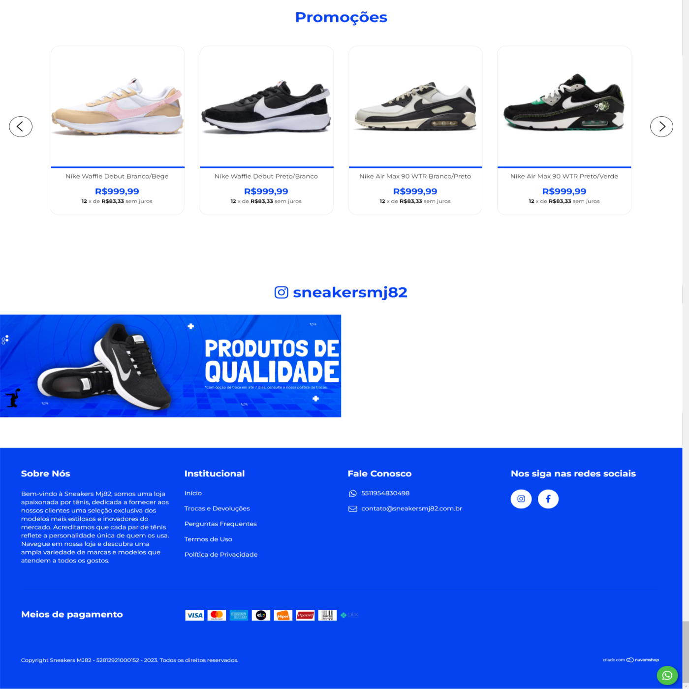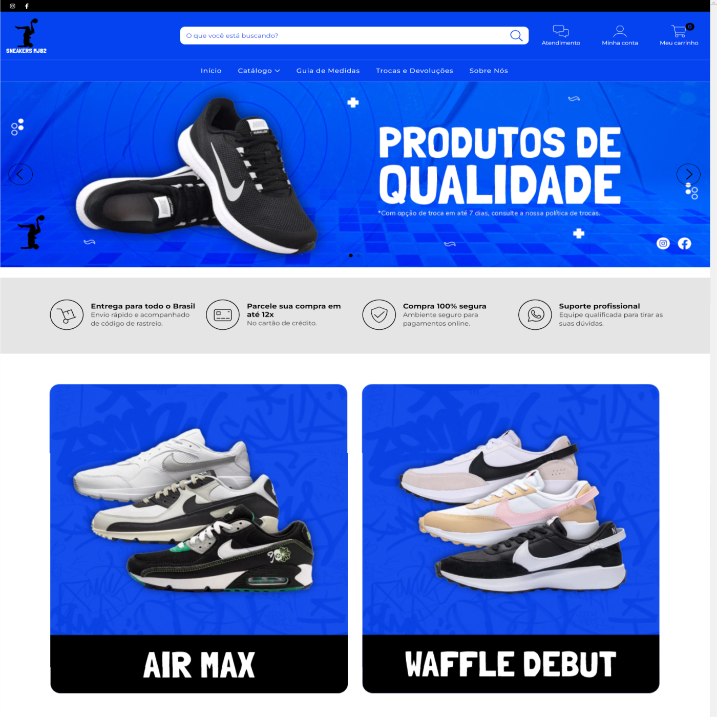 Projeto de loja virtual para a empresa Sneakers MJ82, uma loja online apaixonada por tênis, dedicada a fornecer aos clientes uma seleção exclusiva dos modelos e marcas mais estilosas e inovadoras do mercado. Meu principal objetivo nesse projeto foi destacar a qualidade e a singularidade de cada modelo vendido na loja, dando ênfase nos produtos 100% originais e nas excelentes condições de pagamento e entrega.